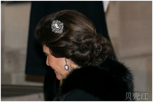 西爾維亞王后在出訪法國的歡迎儀式上把胸針作頭飾佩戴