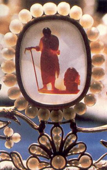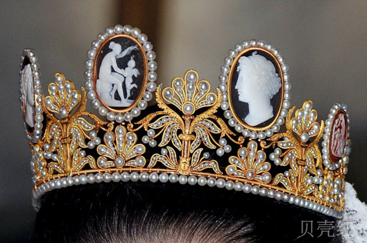 這頂貝雕王冠造型雖然傳統(tǒng),但上面鑲嵌的優(yōu)雅浮雕的寶石卻令王冠如此地與眾不同,充滿藝術(shù)氣息,珍珠與浮雕寶石結(jié)合的創(chuàng)意令世人過目不忘。尤其王冠上的七個浮雕,分別有不同的顏色、形狀, 每個浮雕圖案是源自希臘神話故事,有著美好的寓意。