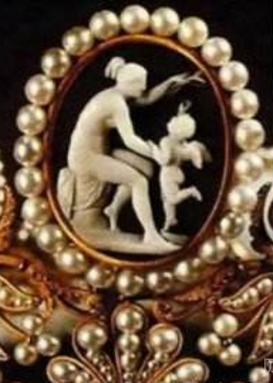 約瑟芬貝雕王冠自誕生至今已流轉(zhuǎn)兩百年,紅色黃金鑲嵌珍珠作為底托,四周是金銀花造型,白色作為主色調(diào),有7 個高出平面的貝殼浮雕,貝雕上刻有希臘神話故事的人物,表達不同的含義:中心貝雕表達愛,刻有母親和孩子,左右兩個分別是一個男子和女子的半身像,他們共同注視著中間這對母子??亢蟮膬蓚€是一個拄拐杖的男人和在女神膝蓋上的丘比特。